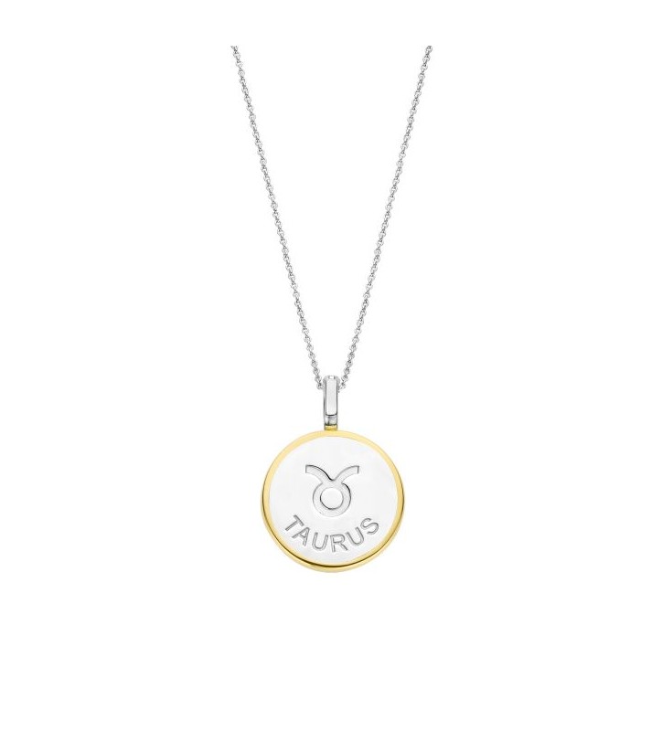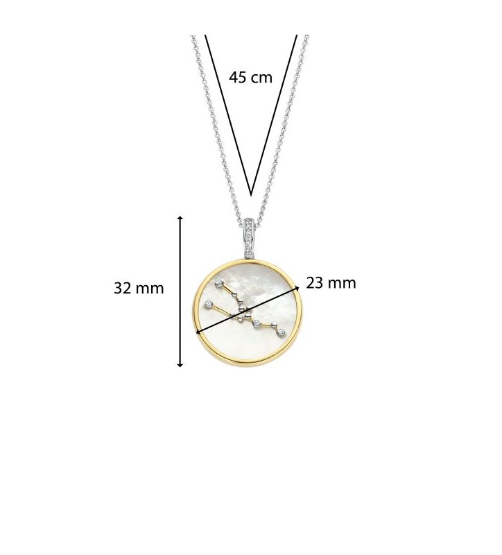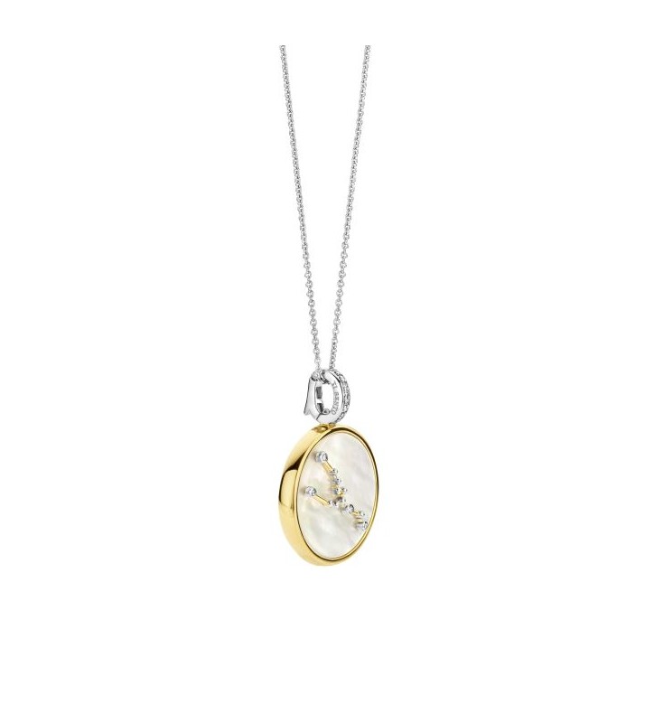 Odkryj swoją gwiezdną biżuterię – zawieszka wykonana ze srebra próby 925 z oprawą ze złota i lśniącą masą perłową. Na awersie wyryty jest znak Twojego zodiaku w postaci subtelnej linii gwiazdozbioru wysadzanej cyrkoniami, na rewersie – jego nazwa. To personalizowany amulet podkreślający Twój charakter, talenty i historię życia.