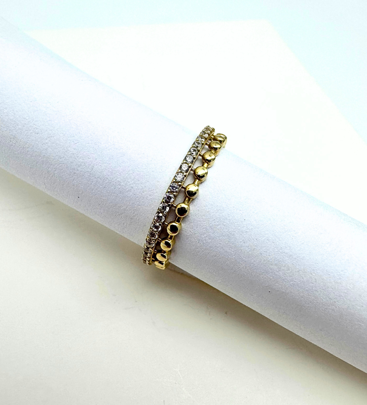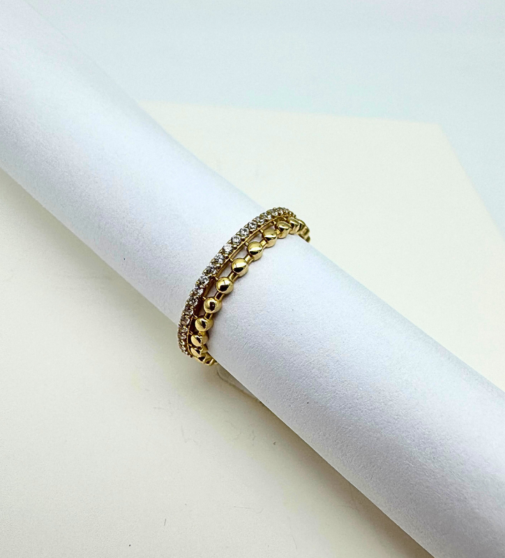 Złoty pierścionek z białymi cyrkoniami i złotymi kuleczkami, złoto próby 585, 14k