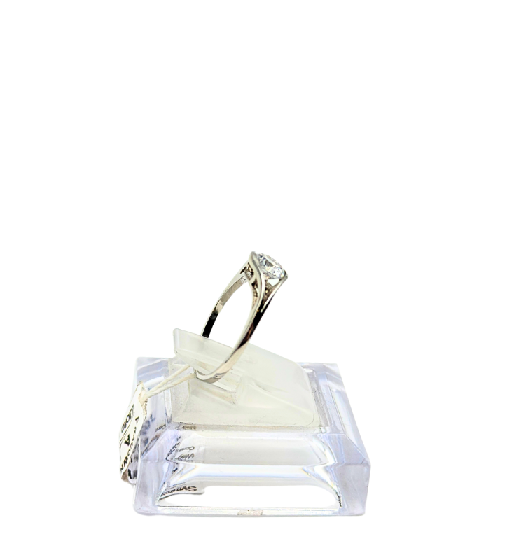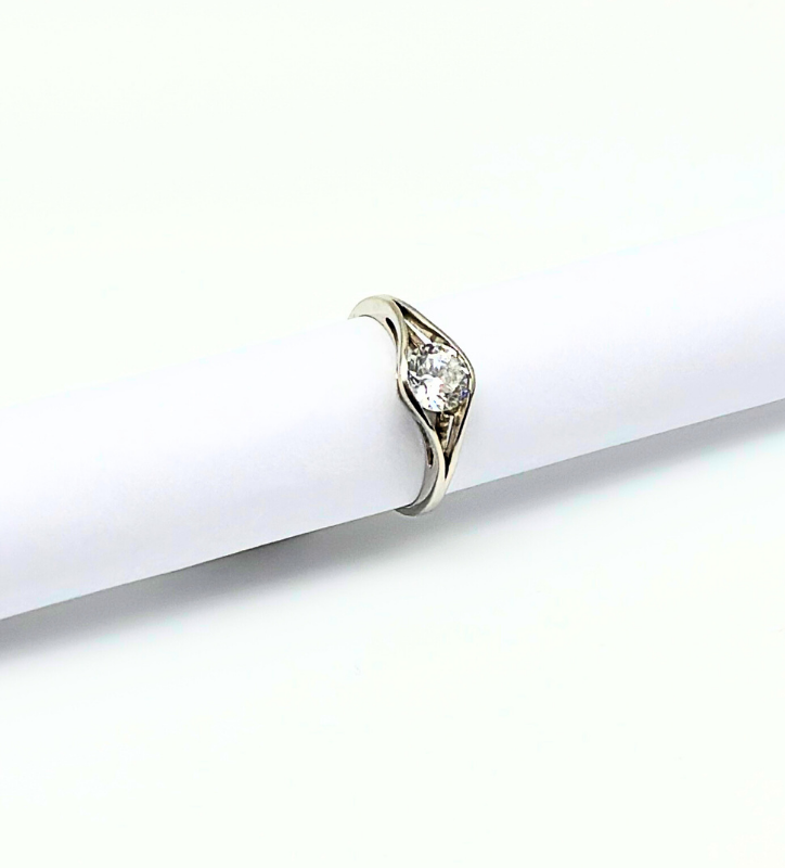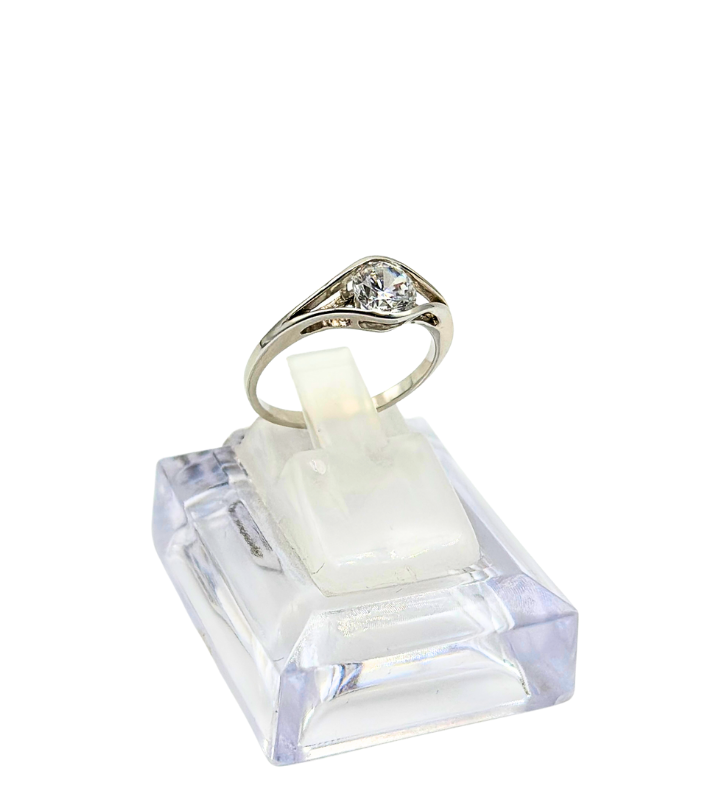 Złoty pierścionek z białą cyrkonią, wykonany z 14-karatowego białego złota próby 585.