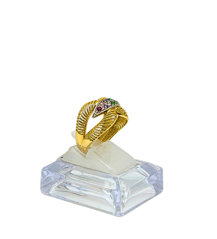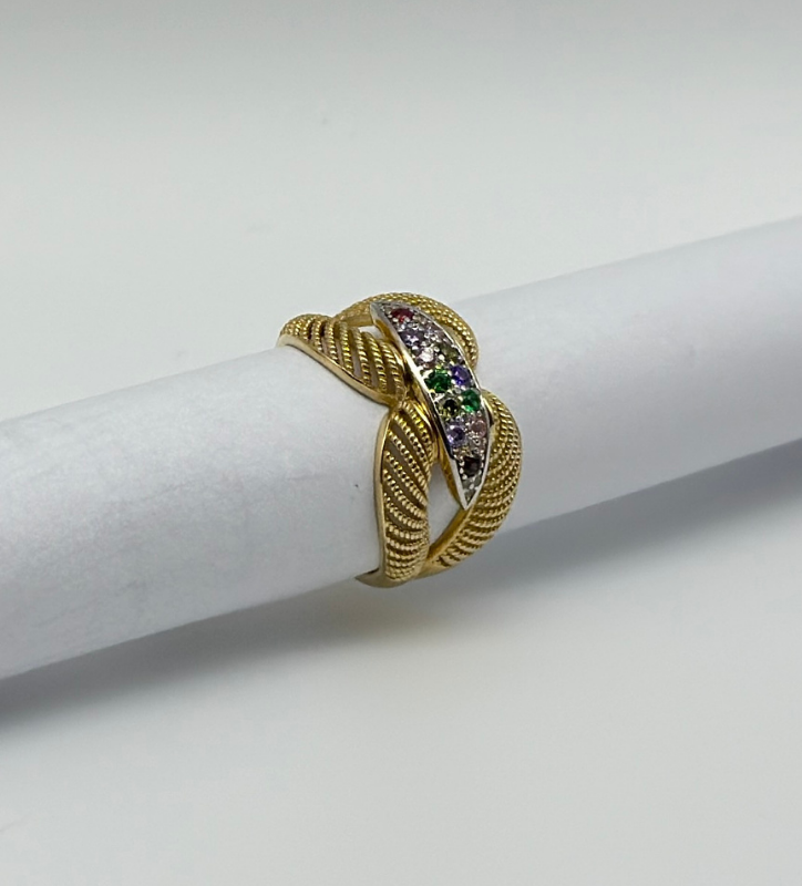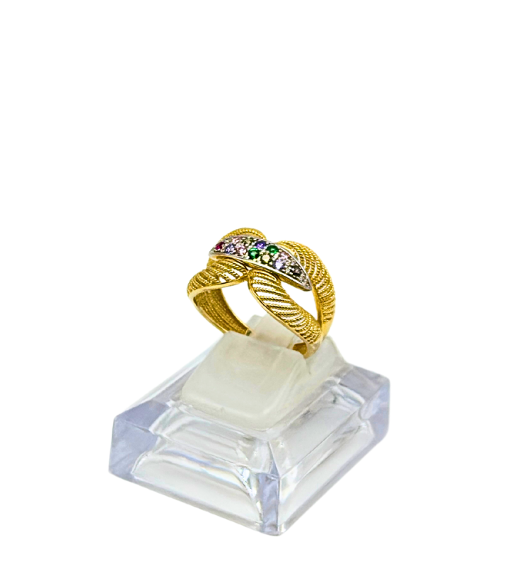 Złoty pierścionek z cyrkoniami, wykonany z 14-karatowego złota próby 585.