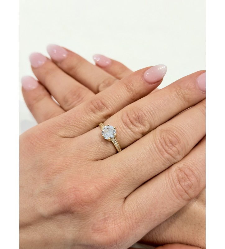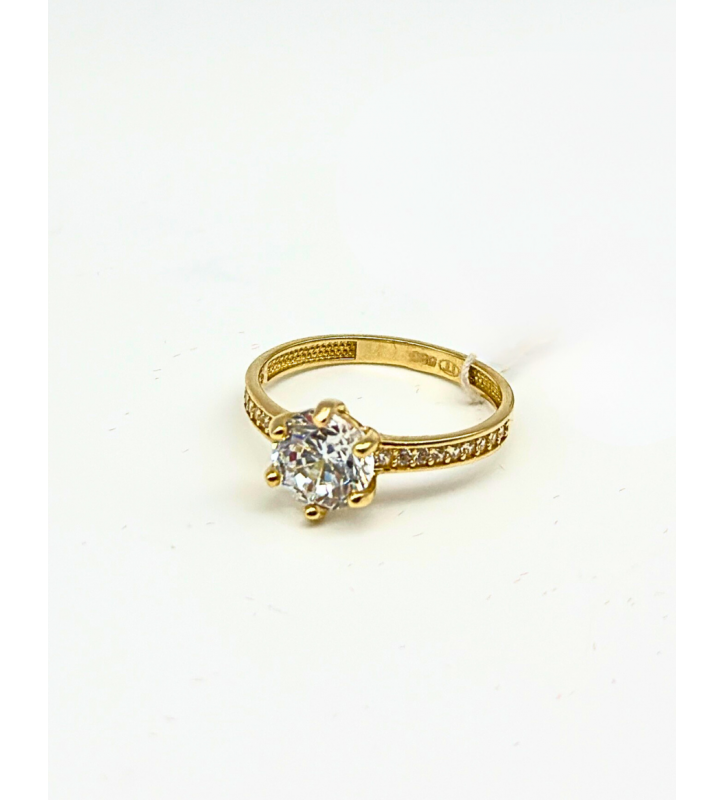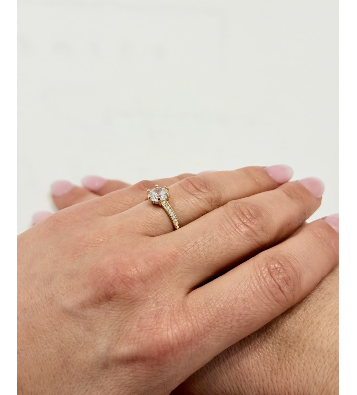 Delikatny połysk złota i blask cyrkonii sprawiają, że pierścionek pięknie prezentuje się samodzielnie, ale równie efektownie wygląda w połączeniu z innymi pierścionkami. To także doskonały pomysł na prezent dla osoby, która ceni klasykę w nowoczesnym wydaniu.